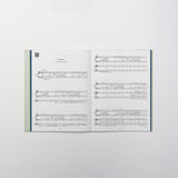 Thoughtfully designed, 135-page book with an open spine – so that the book lies completely flat while in use – and access to individual partiture for the pieces written for larger ensembles.